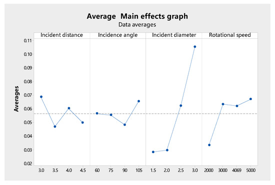According to the rules of ANOVA, when the p-value was less than 0.05, this indicated that the factor had a significant effect on the test results. The incidence diameter had the most significant influence and was the key influencing factor parameter for the gear’s power loss, as shown in Table 4 with the incidence diameter’s p = 0.010 of less than 0.05 value. The p-value of 0.103 for the rotational speed was the secondary factor. The p-values of 0.273 and 0.471 for the incident distance and incident angle, respectively, were non-essential influence parameters. This was also a good indication of the correctness of the extreme difference analysis.