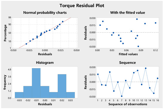 From the graph, it can be observed that the torque residuals were distributed normally. In a normal probability plot, the residuals are distributed around a straight line. The residual distribution histogram, residuals against fitted values plot, and residuals versus observed order plot all show that the torque residual values were within −0.030 and 0.030 and randomly distributed on both sides of the reference line. As can be seen in Figure 16, the residuals and the scatter points of the factors were all on vertical straight lines without bending. Therefore, the equation regression equation was correct based on the above analysis.