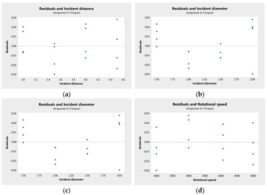 Scatterplot of residuals with each factor. (a) Residuals from incident distance. (b) Residuals from incident angle. (c) Residuals from incident diameter. (d) Residuals from rotational speed.