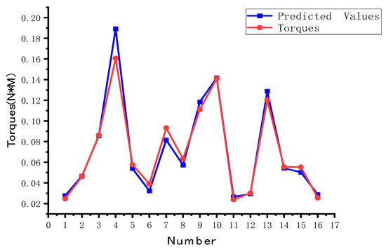 The torque prediction table displayed in Table 6 was obtained using the regression equation to forecast the test data and compare the predicted value with the actual test value; Figure 17 is presented accordingly.