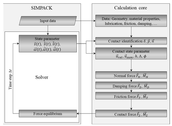 Within the model, a combination of commercial software and self-programmed calculation routines is used. Depending on the level of detail, all bodies of a rolling bearing are modeled with their real geometries. In this work, the most detailed model structure available is described. In order to define the bodies, markers, forces, and boundary conditions, a graphical user interface is used. It was also developed in this work and can access a database of selected bearings and lubricants. This allows for user-friendly model generation. The force elements of the model use the self-written routines to calculate the individual force components in the contact (normal force, damping, and friction). The flow chart in Figure 1 shows a simplified diagram of the procedure followed within the MBS model to calculate contact forces between the single elements by means of roller and ring raceway contact.