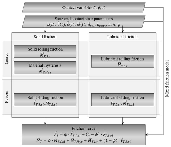 The resulting friction force is calculated by summing the two friction force components (solid sliding friction and EHL sliding friction, or lubricant shear). Following Steinert, they are weighted with a dimensionless key figure for the solid body friction component [80].
