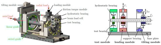 Furthermore, the test bearing is accessible for additional measurements such as cage or rolling element speed. The bearing can be loaded in the radial and axial directions. The tilting module also allows tilting and/or skewing of the test bearing, which was not used in the investigations presented here.