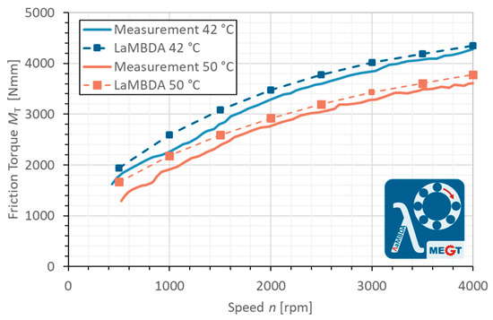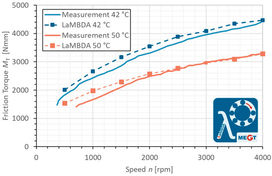 As shown in Figure 5, the frictional torque obtained in the simulation (LaMBDA 50 °C) when submitted to an axial load of 6.5 kN and a shaft speed of 500 rpm is about 1.200 Nmm. The value is rising with an increasing shaft speed up to 3800 Nmm. It can be observed that the simulated friction curve follows the measured one (measurement at 50 °C) with a small offset. The simulated frictional torque values are slightly higher. The second measurement shown in Figure 5 was taken at 42 °C. Since the load is the same, the changed frictional torque can be attributed exclusively to the temperature dependence of the lubricant properties. This concerns especially temperature-dependent changes in viscosity. In the simulation, the lubricant properties are included in the calculation of the rolling resistance as well as the losses due to shear of the lubricant. The fact that the simulated frictional torque follows the measured curve for both temperatures very well shows that the modeling of the lubricant properties is quite suitable.