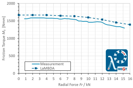 For model validation, the comparison of the frictional torque as an integral parameter of the contact modeling of all internal contacts in the bearing with the measured frictional torque has proved useful. The fictional torque is highly dependent on the load distribution inside the bearing and its dynamics. For this purpose, the total frictional torque is being used as the main outcome for this comparison.