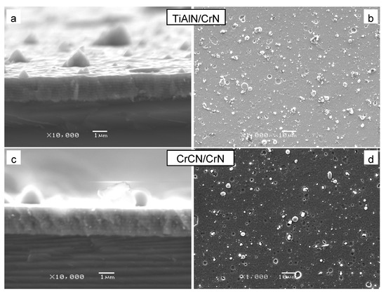 Images of cross-sections (a,c) and surface (b,d) of TiAlN/CrN (a,b) and CrCN/CrN (c,d) multilayer coatings.