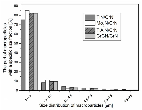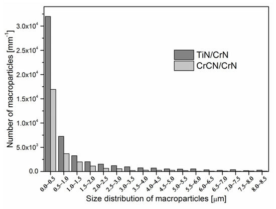 A detailed analysis of the size distribution of the macroparticles was performed for two multilayer coatings: TiN/CrN and CrCN/CrN—Figure 4. The TiN/CrN multilayer coating had almost a two times greater macroparticles surface density compared to the more complex CrCN/CrN coating, while the dimensional distribution of the macroparticles in both coatings was similar. This may have been associated with the lower melting point of the titanium cathode (1660 °C) compared to the chromium cathode (1870 °C).