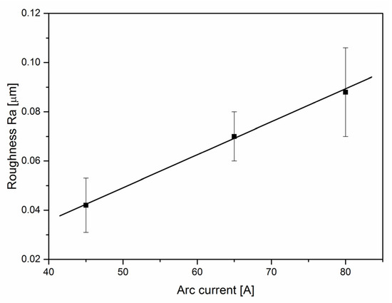 The surface roughness of coatings can be regulated by an arc current—Figure 5, but it should be remembered that a reduction in the arc current decreases the deposition rate of the coating, which increases the time of the deposition process.