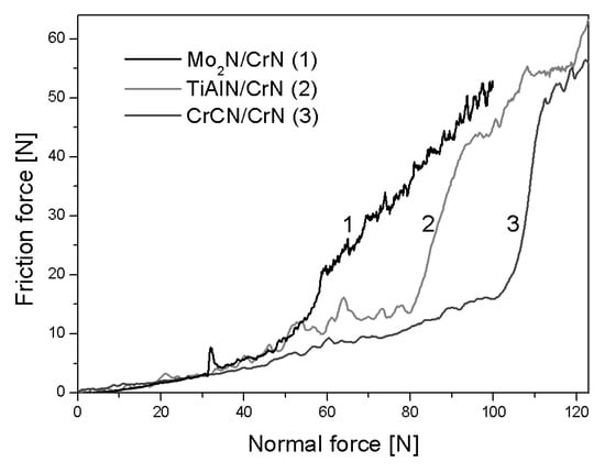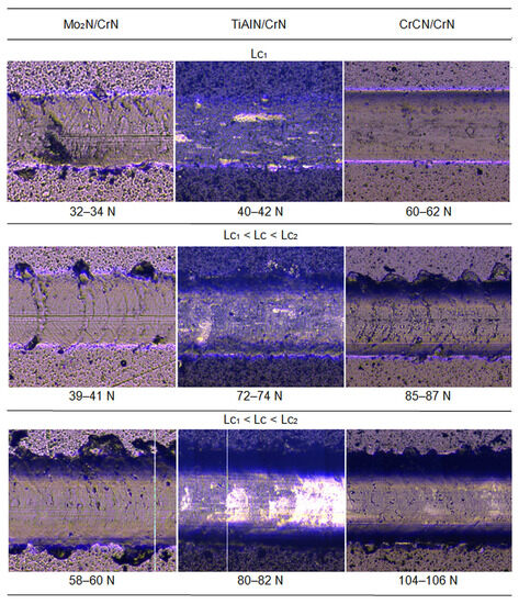 The multilayer coatings discussed were characterized by a good adhesion to the substrate, Figure 6. This amounted to 59 N for the Mo2N/CrN coating, 82 N for the TiAlN/CrN coating, and about 105 N for the CrCN/CrN coating. These values are close to those presented in the literature, although some single-layer coatings have a lower critical load [18,28,43,44].
