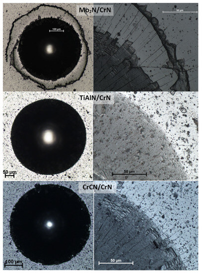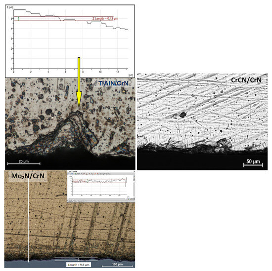 In the TiAlN/CrN and CrCN/CrN coatings, probably due to their slightly lower hardness, only radial cracks occurred, which are frequent in the case of brittle coatings showing a good adhesion. In the TiAlN/CrN coatings, angular intersecting cracks also appeared, which may have contributed to an easier detachment of the coating from the substrate, as shown in Figure 8. The coatings tested were characterized by a good adhesion and they belonged to the group of HF1.