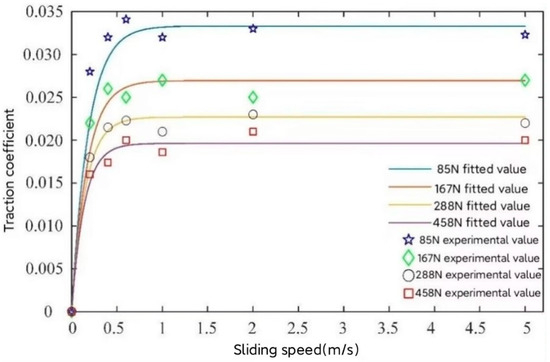 Comparison between fitted value and experimental value of traction coefficient formula.