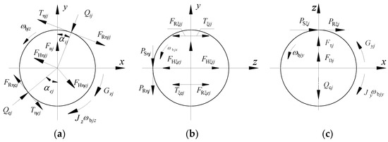 where is the mass of the inner ring; , and are the acceleration of the inner ring; , and are the principal moments of inertia of the inner ring; , and are the angular velocity of the inner ring; and are the angular acceleration of the inner ring; , , , and are the supporting forces and moments of the bearing to the rotor; is the radial distance between the contact point of the ball and the raceway of the inner ring and the centroid of the inner ring, .