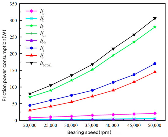 The variation laws of various friction power consumption under the working conditions of an axial load of 2000 N, a radial load of 800 N, and an inner ring speed range of 20,000~50,000 rpm were obtained through simulation, as depicted in Figure 3. It can be observed from Figure 3 that all types of friction power consumption in the bearings increase with the increase in bearing speed, resulting in an overall increase in total friction power consumption. The maximum total friction power consumption is 316.4 W, while the minimum is 77.8 W. Among these, the friction power consumption due to the spin sliding of the ball has the greatest impact on the total friction power consumption, while the remaining friction power consumption has little influence on it.