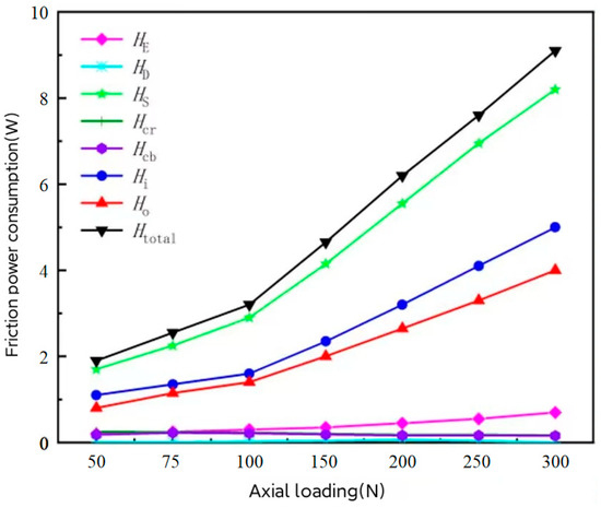 Similarly, under the working conditions of 0 N radial load, 20,000 rpm bearing speed, and 50~300 N axial load, the variation laws of various types of friction power consumptions with axial load were obtained through simulation, as depicted in Figure 4. It can be seen from Figure 4 that the total friction power consumption has increased from 1.8 W to 8.6 W, and the trend of friction power consumption on the rings is basically consistent with the total friction power consumption.