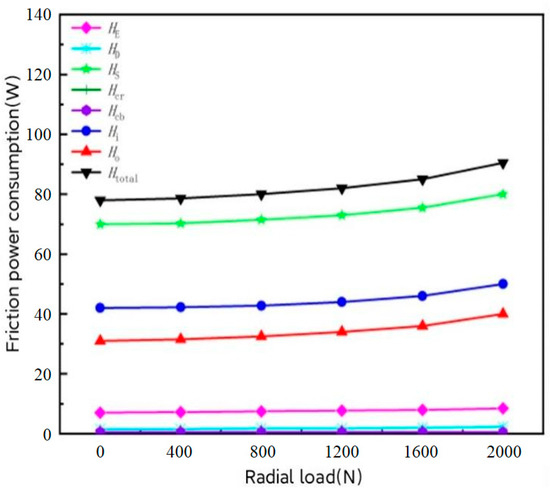 When the axial load is 2000 N and the bearing speed is 20,000 rpm, the variation laws of various friction power consumptions with radial load are obtained through simulation, as depicted in Figure 5. It can be observed from Figure 5 that as the radial load increases, the friction power consumption of the bearings also slightly increases. The total friction power consumption increases from 75.8 W to 88.7 W. Among these, the friction power consumption due to ball spinning and sliding accounts for the largest proportion, while the other types of friction power consumption have minimal impact on the total friction power consumption.
