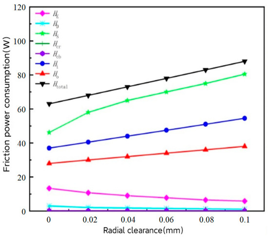 Under the working conditions of a bearing speed of 20,000 rpm, an axial load of 2000 N, and a radial load of 800 N, the simulation results show the change in friction power consumption with radial clearance, as depicted in Figure 6. The analysis reveals that as the radial clearance increases, the total friction power consumption gradually increases. The total friction power consumption rises from 61.7 W to 85.1 W. The power consumption caused by the spin sliding of the steel ball was the same as the changing trend of the total friction power consumption and accounted for the largest proportion of all kinds of friction power consumption.