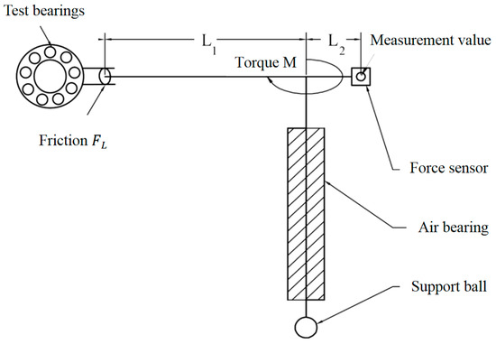 where is the friction torque of the bearing to be tested, in N·mm; is the resistance measured by the force sensor, in N; is the force between the top of the swing lever and the marked point of the O-shaped hoop, in N; is the bearing pitch diameter, in mm; is the distance from the force measuring point to the rotary center of the air bearing, in mm; is the distance from the force sensor to the rotary center of the air bearing, in mm.