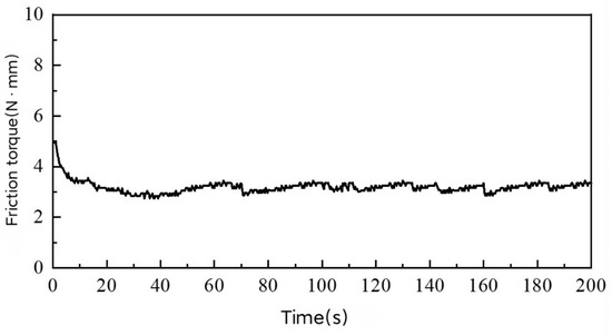 The force at the friction sensor is converted between the arms to obtain the friction torque value. Figure 9 illustrates the collected bearing friction torque at a bearing speed of 20,000 rpm and an axial load of 150 N. The friction torque fluctuates within a certain range with the change in test time. The obtained friction torque from the test can be approximated as the total friction torque. To calculate the friction power consumption of the bearing, it can be obtained by multiplying the total friction torque by the bearing speed, as depicted in Formula (29). The calculated results are then compared with the simulation values obtained from the dynamic model in this study.