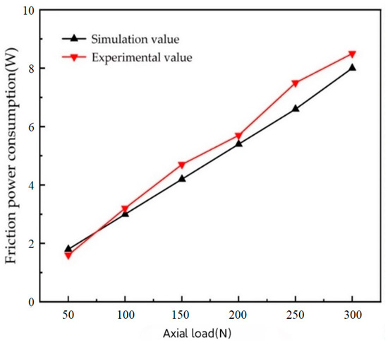As depicted in Figure 10, this study compares the friction power consumption calculated from the experimentally measured root-mean-square value of the total friction torque with the simulation value based on the dynamic model proposed in this study. The results presented in Figure 10 demonstrate that the changing trend of friction power consumption obtained from the experiment is consistent with the simulation result as the axial load increases, indicating the reliability of the friction power consumption calculated in the dynamic analysis of this study. Additionally, the comparison between the simulation result and the experimental value reveals a certain error, with a maximum deviation of 13.6%. However, this error falls within an acceptable range, indicating that the accuracy of the simulation results is reasonably good.
