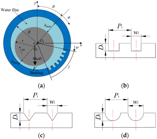 Lubrication model of micro-groove stern tube bearing. (a) Schematic diagram of micro-groove stern tube bearing structure; (b) rectangular structure of micro-grooves; (c) triangle structure of micro-grooves; (d) semi-circular structure of micro-grooves. Adapted from [15].