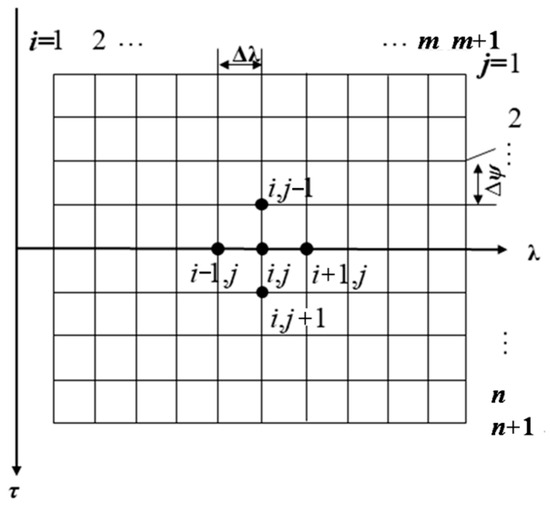 The finite difference method [34,35,36,37] is used to solve the Reynolds Equation (7) by dividing m mesh cell along the axial direction (λ direction) of the bearing and n mesh cell along the circumferential direction (τ direction) of the bearing; the mesh division is shown in Figure 2.