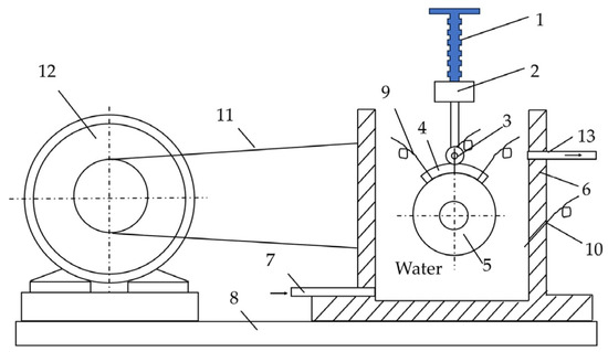 Test bench schematic: 1. screw for loading; 2. sensor for measuring loading force; 3. roller for loading; 4. test plate material to be tested; 5. shaft; 6. water tank; 7, 13. water hole; 8. base; 9. pressure sensor; 10. temperature sensor; 11. belt; 12. motor.