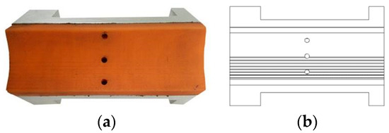To verify the correctness of the fluid solid coupling mathematical model of the water-lubricated micro-groove texture stern tube bearing, the lining material of the test strip was Thordon, the elastic modulus was 490 MPa, the density was 3220 kg/m3, and Poisson’s ratio was 0.45. The slab shell was 6061 aluminum alloy. The lining and shell were pasted with epoxy resin. There were two groups of slabs in this experiment: no micro-grooves and local micro-grooves. The shaft diameter was 60 mm, the bearing inner diameter was 60.25 mm, the bearing length was 100 mm, the rectangular groove was a through-type, the span was 0.4 mm, the groove spacing was 2 mm, and the groove depth was 50 μm. The load was 12 N and the speed was 1000 r/min. The local micro-groove lath was a micro-groove with a rectangular cross-section shape uniformly processed from the inlet edge to the circumferential 30° range. The test block with local micro-grooves is shown in Figure 5.