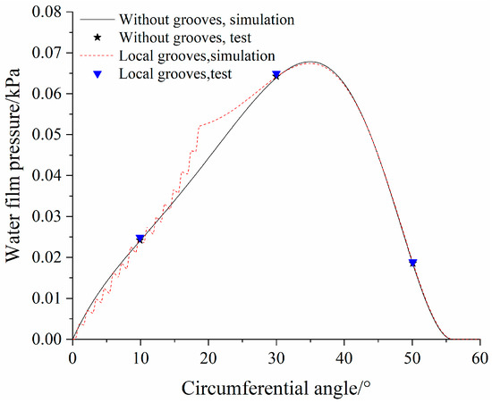 It can be seen from Figure 6 that the simulations of the two types of test blocks without micro-grooves and with local micro-grooves are in good agreement with the experimental water film pressure, thus verifying the correctness of the numerical results.