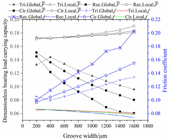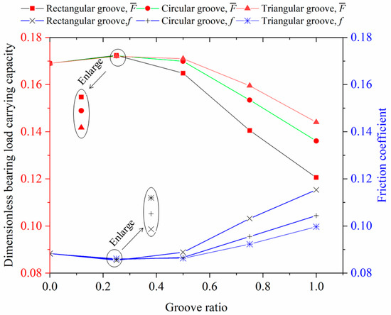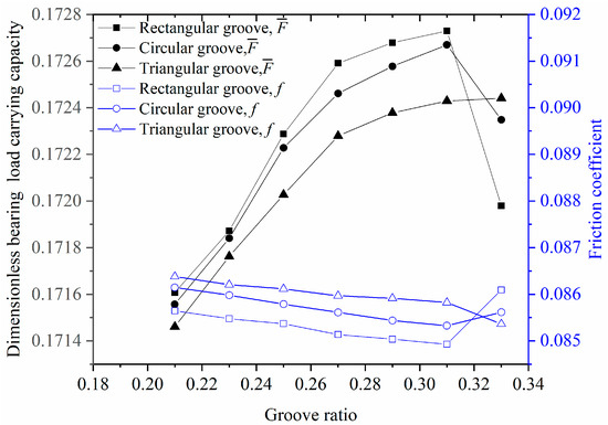 The groove ratio is the ratio of the area of the grooves to the area of the bearing lining. From the above experiments and simulations, the size of the groove area has a certain effect on the bearing load-carrying capacity. Therefore, we designed three kinds of through-type grooves with different cross-sectional shapes: rectangle, circle, and isosceles triangle. The shapes of the designed groove sections are shown in Figure 1. The geometric parameters of the groove were Wt = 0.4 mm, Dt = 0.05 mm, and Pt = 2 mm. The speed was 1000 r/min, and the eccentricity ε was 0.3. The groove ratio was set to 0, 0.25, 0.50, 0.75, and 1.00. The dimensionless bearing load-carrying capacity , Equation (11), and friction coefficient , Equation (15), of the stern tube bearings were calculated, as shown in Figure 7.