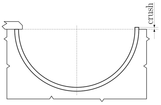 Figure 1a depicts the model of the assembly considered in the analysis, and Figure 1b details the reference system adopted for all the analyses performed using the shell angle θ and the angular speed ω. The dismountable connecting rod, the two tightening bolts, and the big end bearing can be seen. In particular, the connecting rod is made of titanium, the bolts are made of steel, and the bearing is made of steel with a thin coating on the inner surface (see Table 1 for the main mechanical and physical properties of the materials) [26]. Figure 2 shows and defines the bearing crush, i.e., the circumferential (small) over-extent of each half-bearing, which represents an important geometric characteristic of the bearing. When the connecting rod is tightened, the crush is inevitably recovered, and the bearing is compressed and press-fitted into the big end of the connecting rod. Crush values affect the fretting fatigue behavior of the big end. In fact, it directly influences the contact pressure at the interface and, consequently, the possibility of sliding and the relative displacement between the surfaces, which are the main parameters for the determination of the wear work generated at the interface.