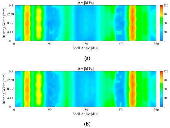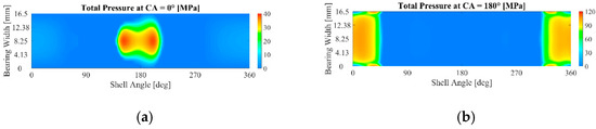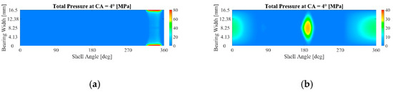 As an alternative to using the elasto-hydrodynamic pressure distribution derived from a multibody analysis of the crank mechanism, the crankpin could be included in the simulation, thus managing the direct contact between the pin and the bearing in the FEM model and consequently neglecting the hydrodynamic aspects [31]. However, since, in this case, it was essential to accurately grasp the pressure distribution between the bearing and the big end, which strongly depends on the interaction between the bearing and the crank pin, it was decided to use the result of the elasto-hydrodynamic model as input. To understand the effects of this choice, consider the results of Figure 5. In particular, Figure 5a shows the distribution of the contact pressure between the crank pin and the bearing when the crank mechanism is close to top dead center during combustion (4° CA) as calculated directly from a FEM model, which manages the direct interaction between the bearing and the pin; on the other hand, Figure 5b shows, for the same instant, the total pressure at the bearing–pin interface when the elasto-hydrodynamic effects are considered. It can be observed that, in this second case, not only is the pressure distribution different because of the influence of hydrodynamic phenomena, but moreover, two diametrically opposed pressure peaks are evident, favored by the lemon-shaped profile of the inner surface of the bearing [32,33,34]; the second peak is absent in Figure 5a where the hydrodynamic effects are neglected.