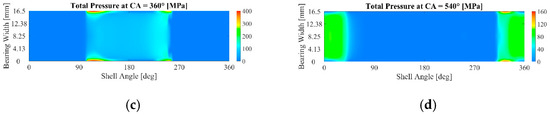 Figure 4. The elasto-hydrodynamic pressure distribution: (a) 0° CA; (b) 180° CA; (c) 360° CA; (d) 540° CA.