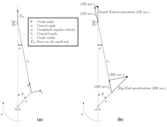 Figure 6. Reference system adopted for the boundary conditions: (a) load on the connecting rod; (b) accelerations at the small end and at the big end of the connecting rod.