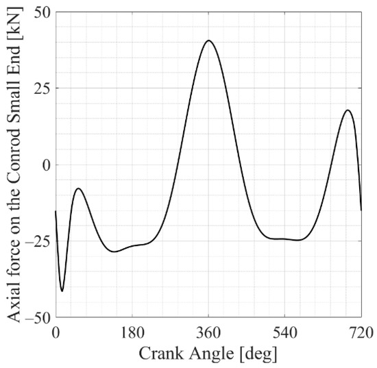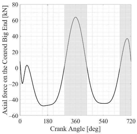 To understand the origin of the high relative displacements concentrated in the vicinity of 360° CA and 720° CA, reference can be made to the profile of the axial force acting on the conrod big end; see Figure 12. At top dead center during overlapping (360° CA), the connecting rod is being pulled by the tensile inertial loads, and the connecting rod cap wraps the crank pin [19]. The load path passes from the shank to the big end, where it goes into the bolts and then down to the cap, finally entering the crank pin via the lower half-bearing. At the same time, the upper half-bearing is substantially unaffected by the load path. This particular behavior makes the connecting rod big end upper sides elongate, not the upper half-bearing, resulting in high relative displacements in this region. Close to top dead center during combustion (0° CA), this phenomenon still appears albeit limited; in fact, when combustion occurs, combustion loads win tensile inertial loads. When looking at bottom dead center (180° CA, 540° CA), the relative sliding between the bearing and the big end is considerably reduced compared to the previous scenario. In fact, both the connecting rod big end and the upper half-bearing are tightly pressed against the crankpin, while the connecting rod cap is nearly completely unloaded, together with the lower half-bearing.
