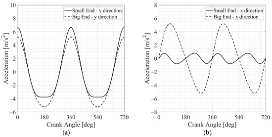 Figure 8. Acceleration applied on the connecting rod: (a) component aligned with the connecting rod axis; (b) component orthogonal to the connecting rod axis.