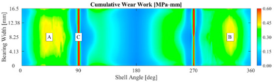 Figure 9 shows the cumulative specific wear work on the internal surface of the big end evaluated by simulating the whole engine cycle. Please refer to Figure 1b for the reference system adopted. The maximum values are localized in the area where the shank joins the big end; see points A and B in Figure 9. Please note that local high values of the wear work registered at the contact between the big end and the cap (see point C of Figure 9) were fictitiously promoted by the contact pressure generated at those nodes by the bolt tightening, and they have to be neglected while considering fretting phenomena at the bearing–big end interface.