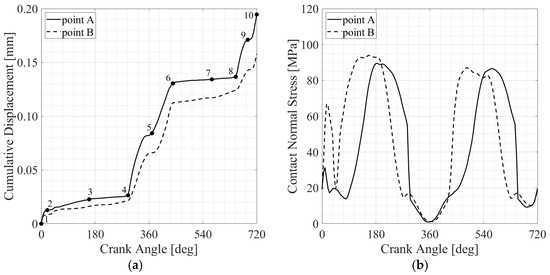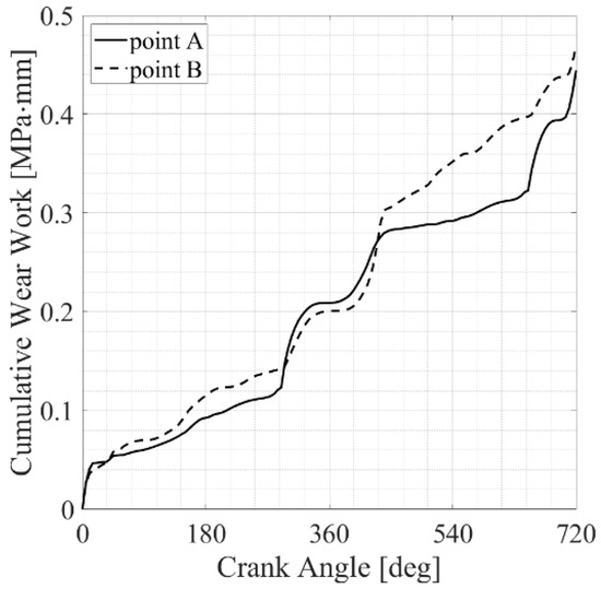 Figure 10 illustrates the cumulative wear work as a function of crank angle for the two selected points A and B. Regions with high gradients of cumulative wear work can be noticed close to 360° CA and 720° CA. In order to identify the reasons driving these local sudden increases in wear work, it is necessary to analyze the profile as a function of the crank angle of the main parameters involved, i.e., the cumulative displacement and the contact pressure at the interface (see Figure 11). Strong parallelism can be seen between the wear work profile of Figure 10 and the cumulative relative displacement profiles of Figure 11a, thus suggesting that relative displacement is the guiding parameter.
