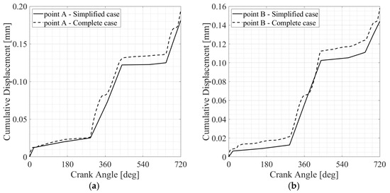 Figure 13. Comparison of the cumulative displacements between the complete and simplified cases: (a) point A; (b) point B.