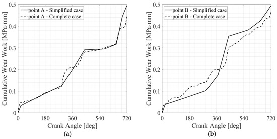 Figure 14. Comparison of the cumulative wear work between the complete and simplified cases: (a) point A; (b) point B.