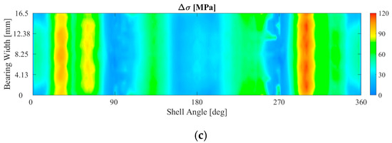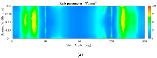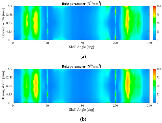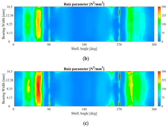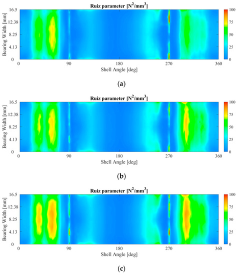 The bearing crush is the first assembly parameter to be evaluated. Three crush values are compared: the baseline case, a 20% reduced crush, and a 20% increased crush. Figure 16b illustrates the variation of the Ruiz parameter on the surface of the connecting rod big end in the baseline case, while Figure 16a,c display the Ruiz parameter values for the reduced crush and increased crush cases, respectively. It is evident that increasing the crush led to a higher intensity of fretting fatigue. Specifically, following a 20% increase in crush height, a corresponding 10% rise in the Ruiz parameter is observed. Conversely, reducing the crush height by 20% led to an approximately 8% decrease in the Ruiz parameter. However, it is useful to discuss the contributions associated with circumferential alternating stress and wear work individually.