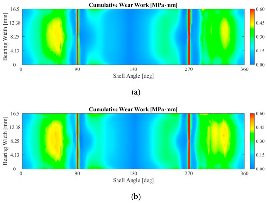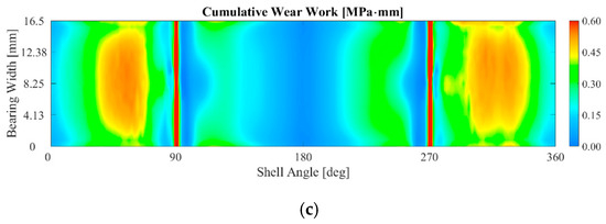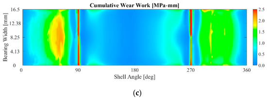 Figure 23. Cumulative wear work: (a) 0.1 friction coefficient; (b) 0.4 friction coefficient; (c) 0.6 friction coefficient.