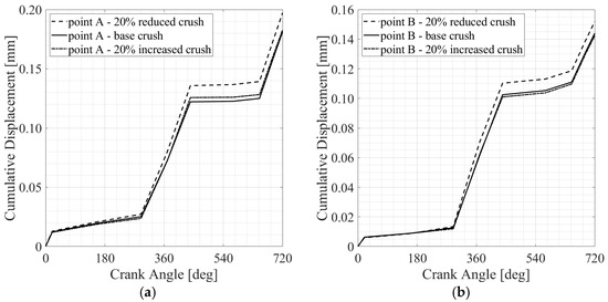 Figure 19. Comparison of the cumulative relative displacements for the different crush values: (a) point A; (b) point B.