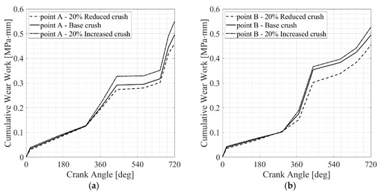Figure 20. Comparison of the cumulative wear works for the different crush values: (a) point A; (b) point B.