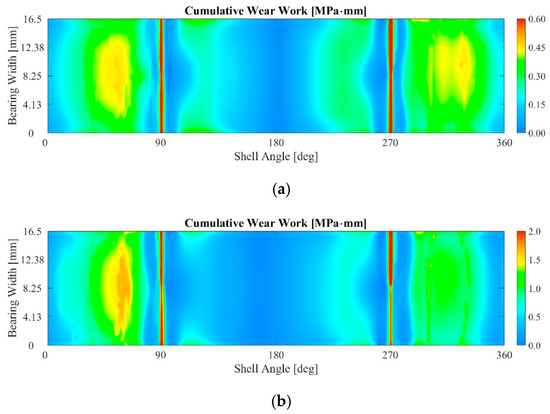 Figure 18a–c present the cumulative specific wear work values for the reduced crush, baseline, and increased crush configurations, respectively. It can be noted that wear work increases with an increase in crush. This result can easily be justified if one considers that as the bearing crush increases, the press-fitting pressure at the bearing–big end interface also increases. At the same time, higher press-fitting pressures can lead to lower relative displacements, possibly compensating for the effect of the pressure increase in the wear work evaluation; see Equation (2). In this case, however, a marginal influence of the bearing crush on the cumulative relative displacement is observed (see Figure 19), and the effect of increasing press-fitting pressure wins out in driving the increase in cumulative wear work (see Figure 20).