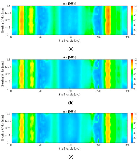 Figure 17. Circumferential stress amplitude: (a) 20% reduced crush; (b) baseline crush; (c) 20% increased crush.