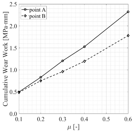 Figure 25. Cumulative wear work as a function of the friction coefficient for the two selected points A and B on the inner surface of the big end.