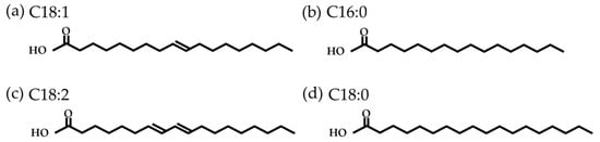 Common fatty acids found in olive oil: (a) oleic acid; (b) palmitic acid; (c) linoleic acid; (d) and stearic acid.
