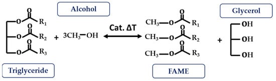 Transesterification reactions are the most widely used technique for ester modifications, especially in the biodiesel industry. As shown in Figure 6, it is based on the reaction between a triglyceride and an acyl acceptor (an alcohol) in the presence of a catalyst, and under temperature conditions, to produce fatty acid methyl ester (FAME) as the main product and glycerol as the secondary product. The catalyst function aims to assist the reaction and the deprotonation of the alcohol so that it can join the ester group. These can be acid, basic, or enzymatic catalysts, as well as homogeneous or heterogeneous (depending on the reaction phase) [,,].