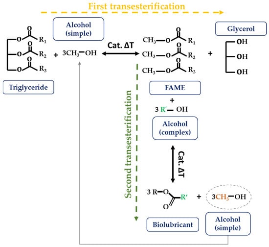 More recently, Encinar et al. [,,,,] have worked on the modification of vegetable-oil-derived FA using double transesterification reactions. In the first step (Figure 7), the triglyceride is degraded to the corresponding FAME. The novelty of this process lies in the second step, in which another transesterification reaction is carried out on these FAMEs, this time using a complex alcohol as a reagent, to obtain the so-called fatty acid alkyl [] esters (FAAEs). According to the researchers, the advantage of this refinery model is the diversity of the main products, starting with the use of bio-oil; the production of biodiesel (FAME) and biolubricants (FAAE); the economic and energy savings with the recovery of materials such as glycerol, as well as the recycling of methanol produced during the second transesterification, which can be reintroduced into the process as a reagent in the first transesterification []. So far, only vegetable feedstocks such as safflower, cardoon, rapeseed, soybean, or Jatropha oil have been subjected to this technique.
