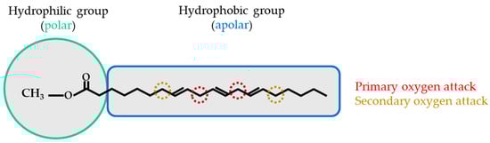 The molecular structure of these compounds can contain zero (saturated), one (monounsaturated), or multiple C=C double bonds (polyunsaturated). Each FA introduces the double bonds at a specific position in its structure, for example, at the 6, 9, and 12 carbon atom positions []. The presence of double bonds promotes oxygen attack on the carbons adjacent to these bonds, as shown in Figure 8. The areas most affected by this phenomenon are the carbons atoms located between two double bonds, so that the oxidative stability of the structure decreases as the areas of oxygen attack increase [,,]. This oxidative stability refers to the ability of lubricants to retain their properties when exposed to environmental oxygen without suffering oxidative degradation []. It has also shown an increase in PP and a tendency to increase viscosity and decrease viscosity index (VI) by reducing the content of unsaturated FAs [,,].